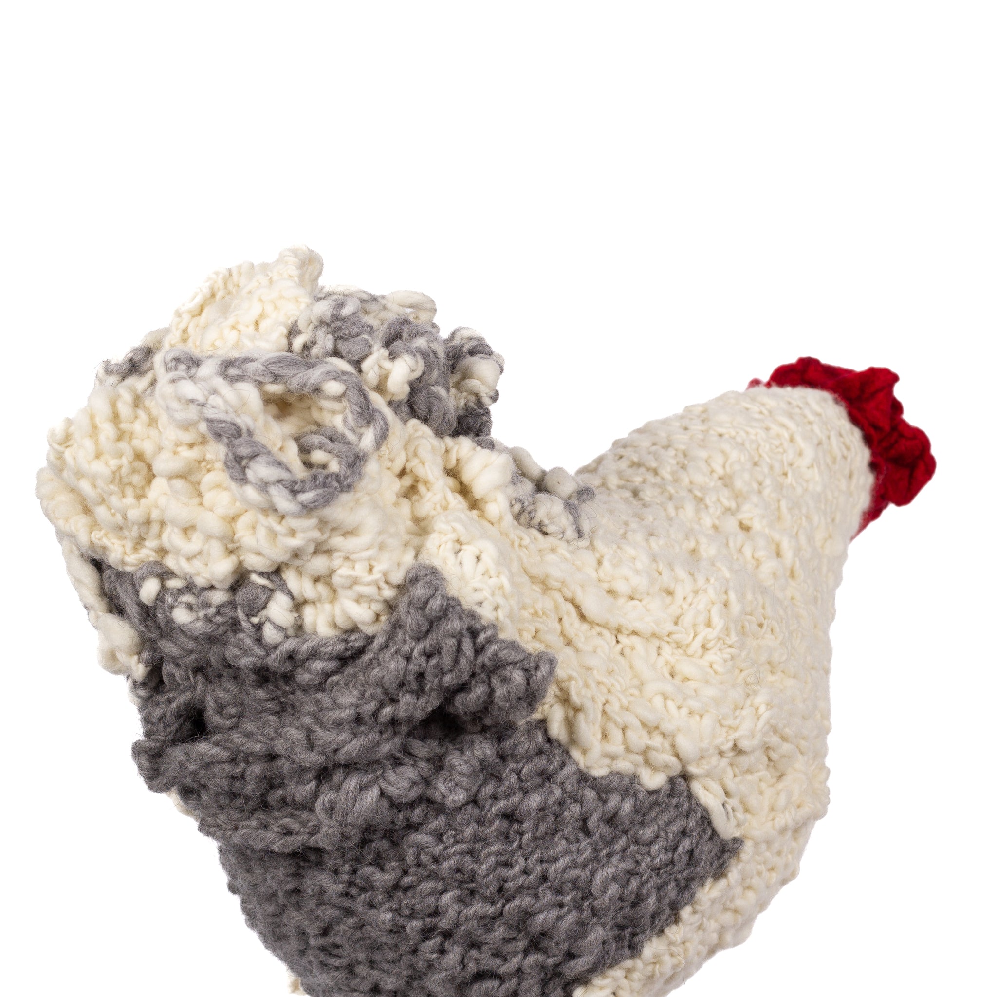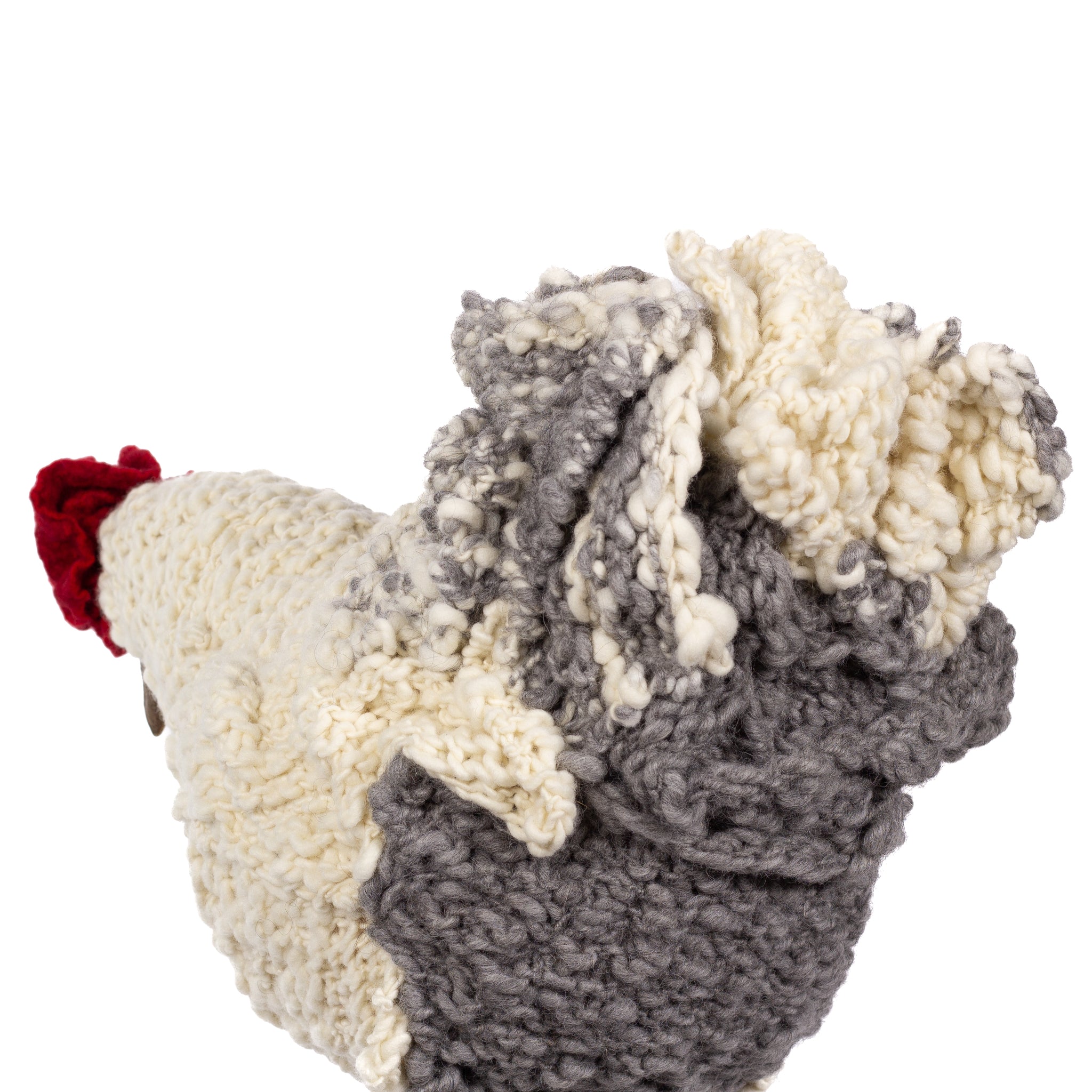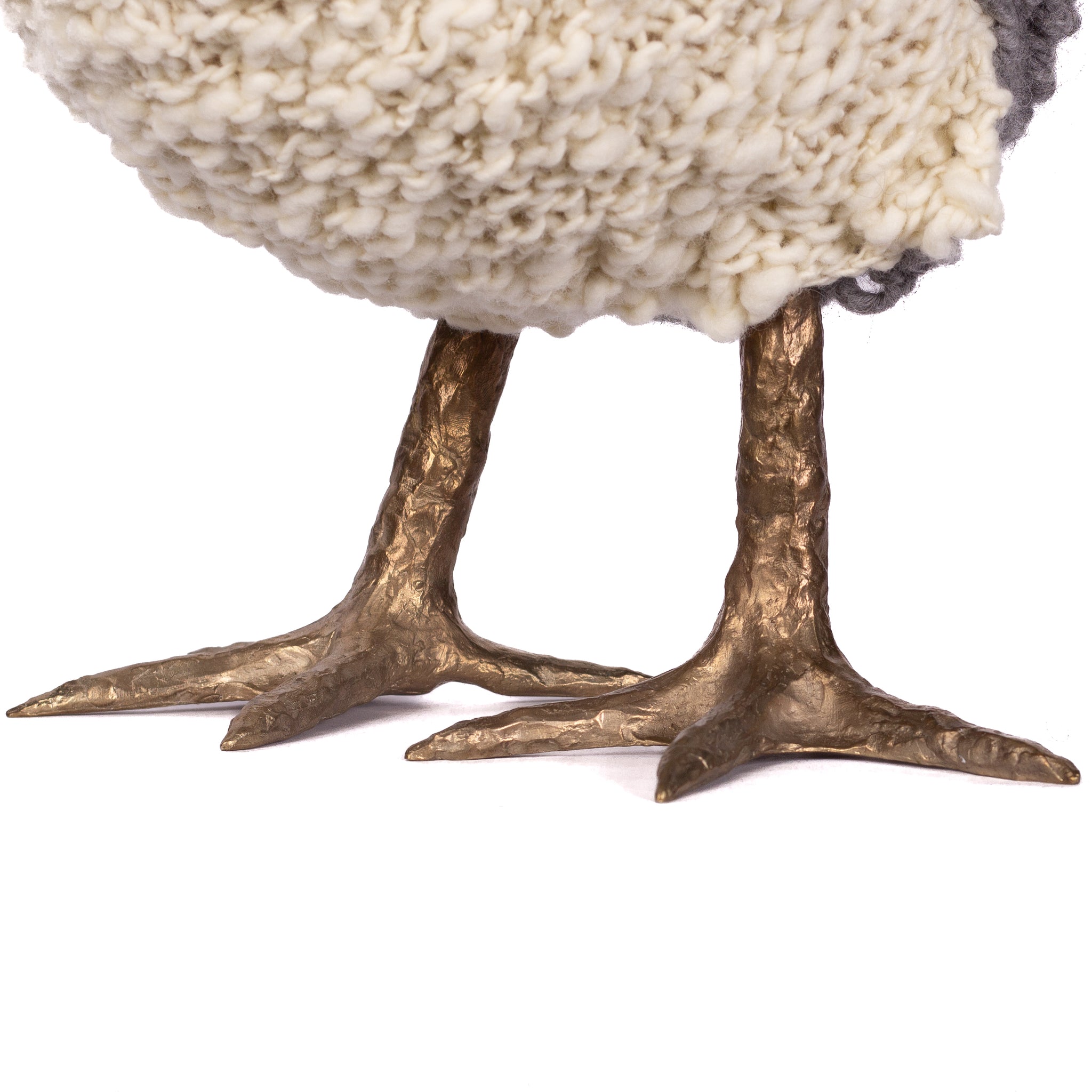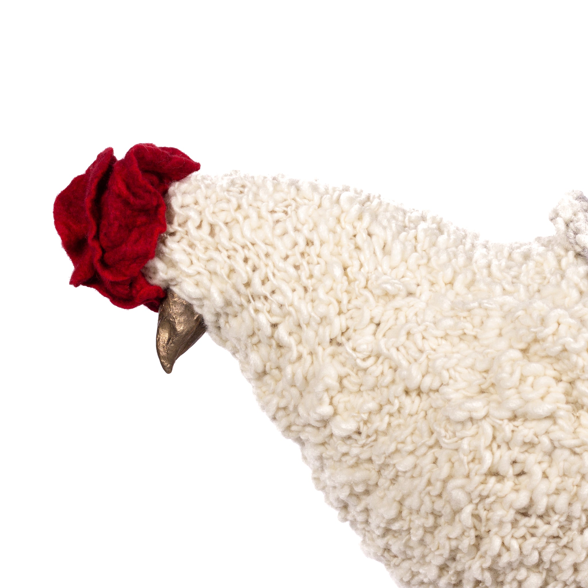 The chickens are sculpted in Kansas City, Missouri with care and delight, upholstered to function as footstools. Each is one-of-a-kind, unique in posture and personality. A turned wood egg-shaped core stands on bronze feet and is connected to a bronze beak. Feathers are fashioned with traditional fiber art techniques- dyeing, felting, spinning, knitting- and are stitched by hand. And a surprise? Their heads bob.