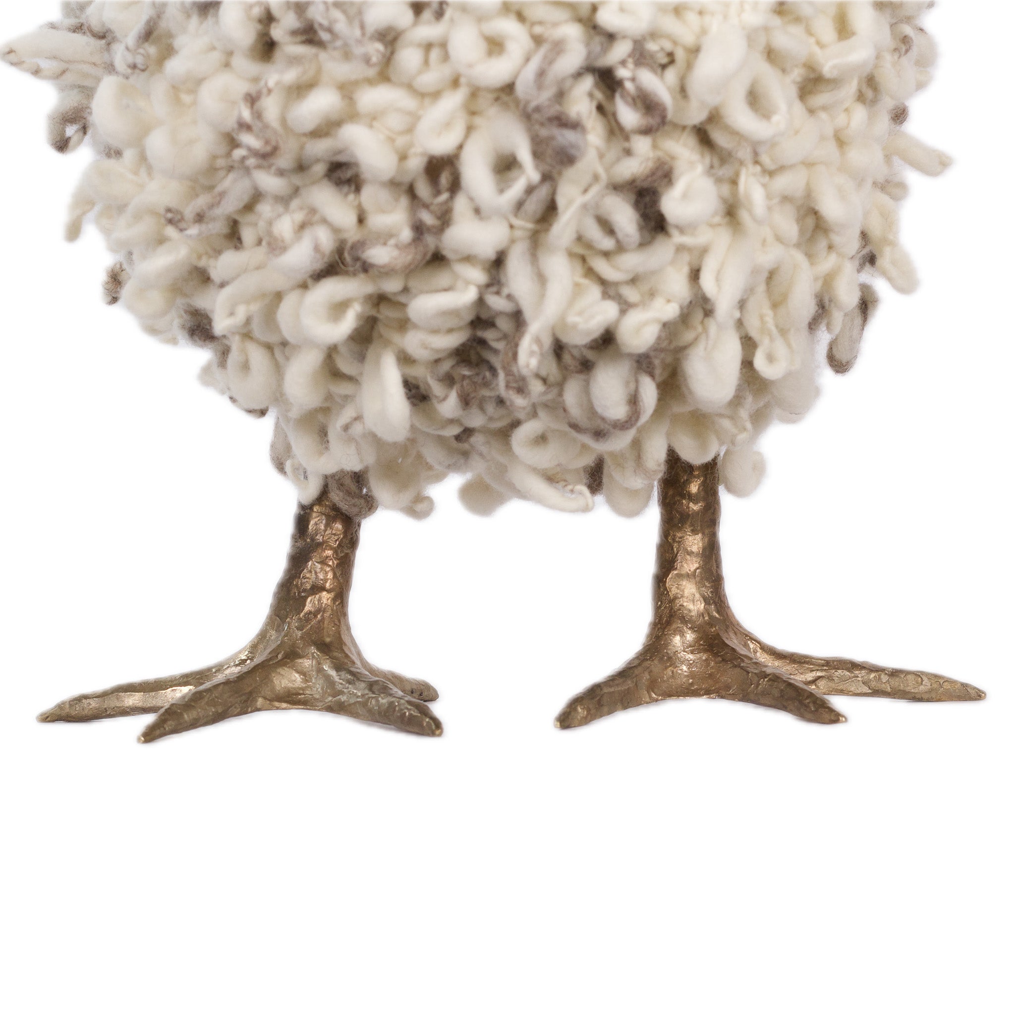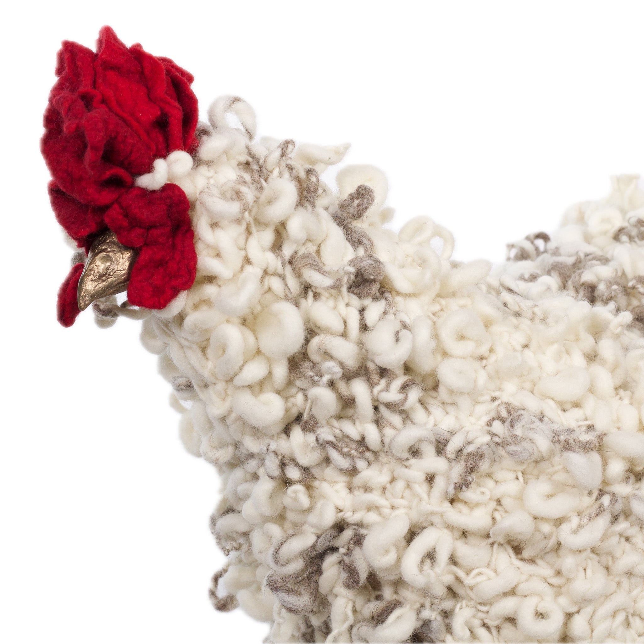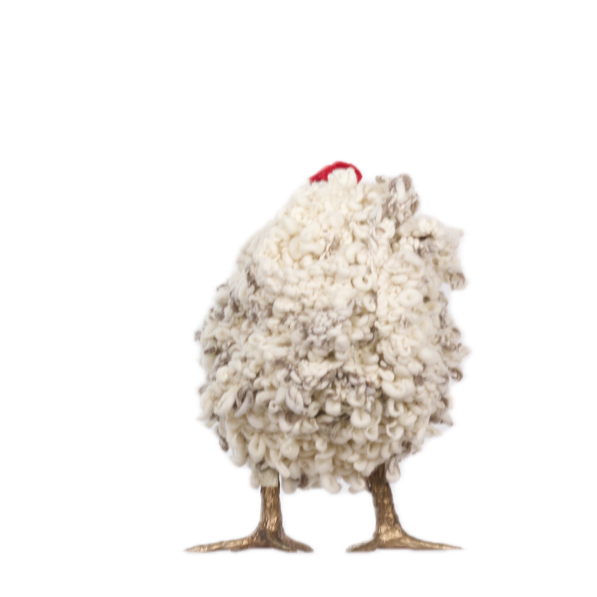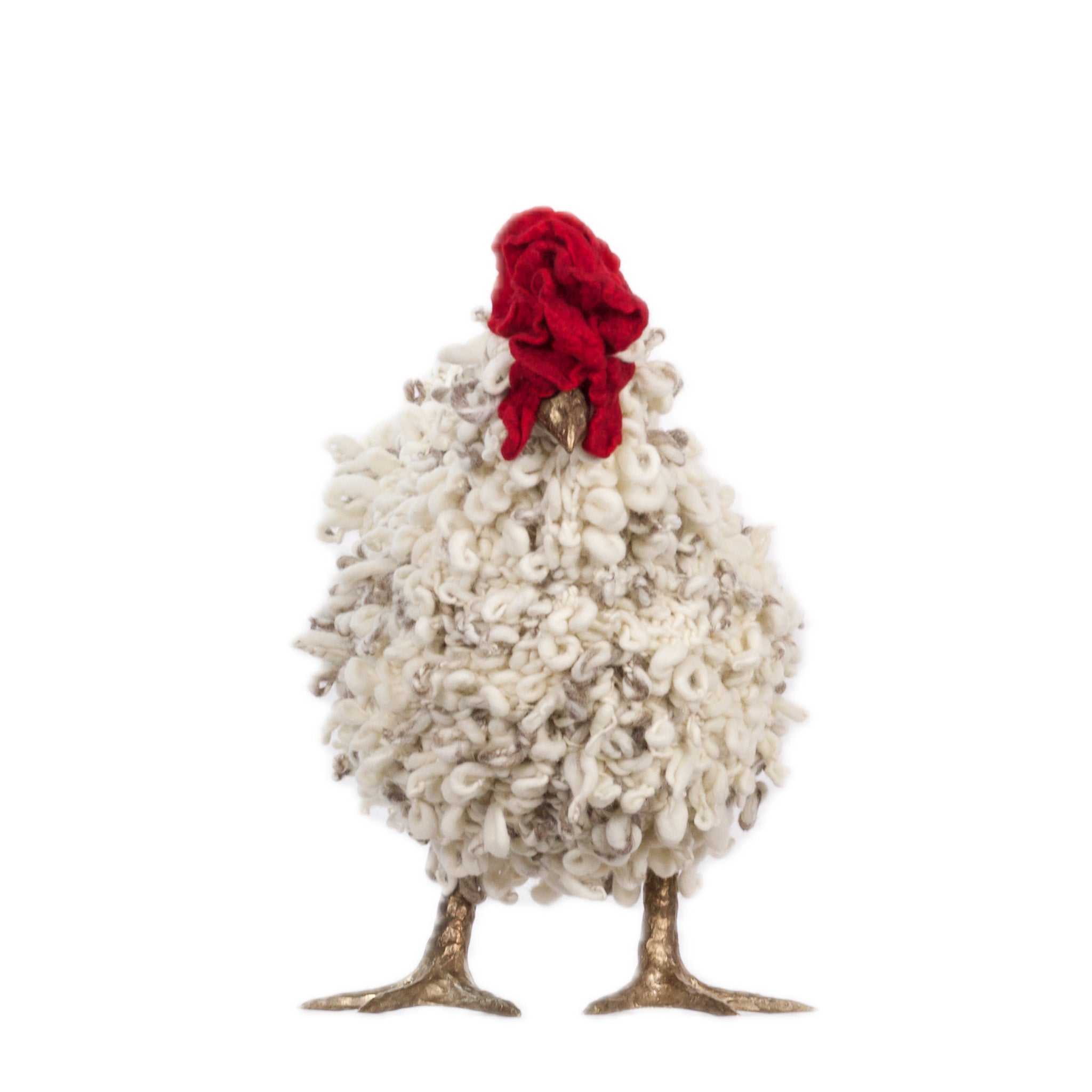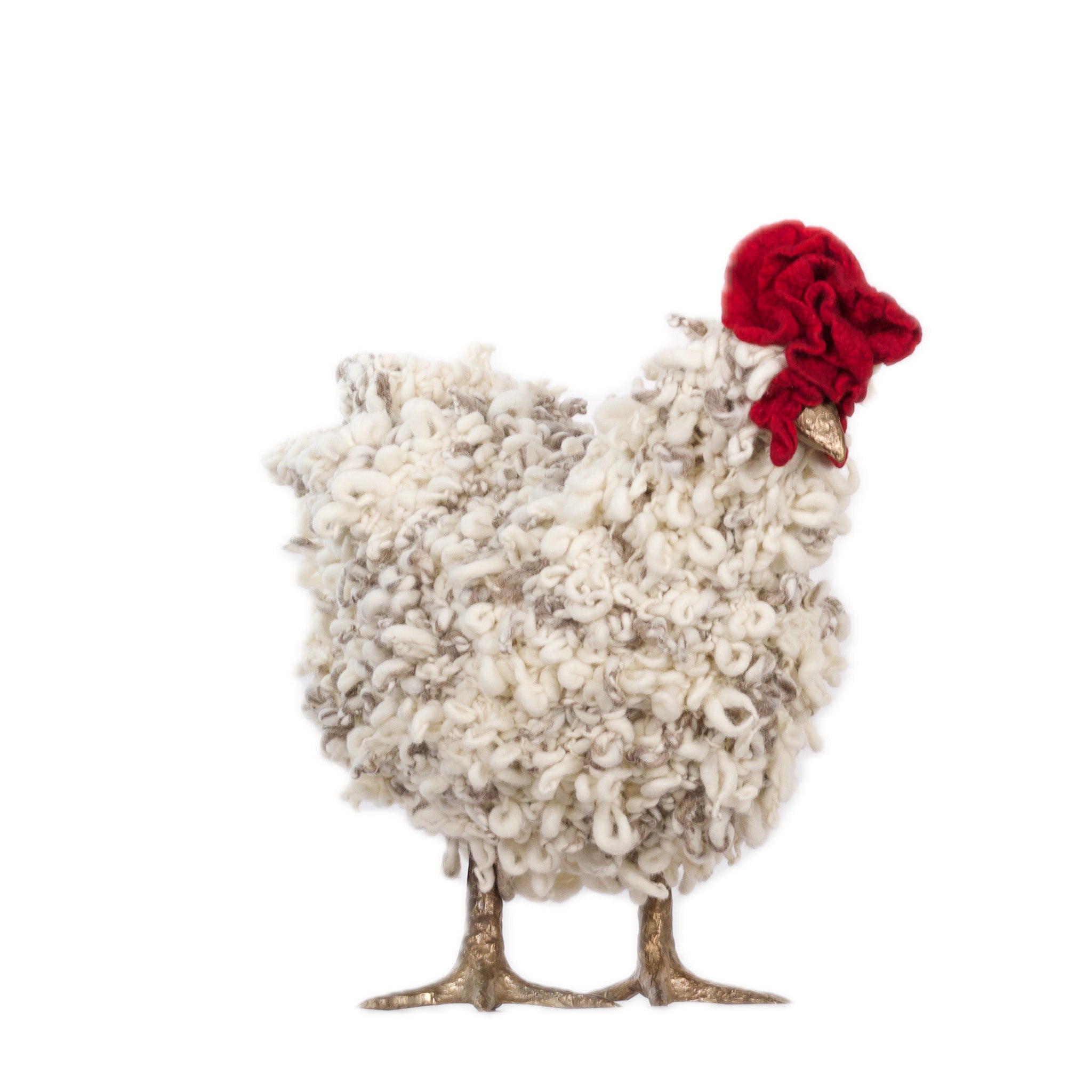 The chickens are sculpted in Kansas City, Missouri with care and delight, upholstered to function as footstools. Each is one-of-a-kind, unique in posture and personality. A turned wood egg-shaped core stands on bronze feet and is connected to a bronze beak. Feathers are fashioned with traditional fiber art techniques- dyeing, felting, spinning, knitting- and are stitched by hand. And a surprise? Their heads bob.
