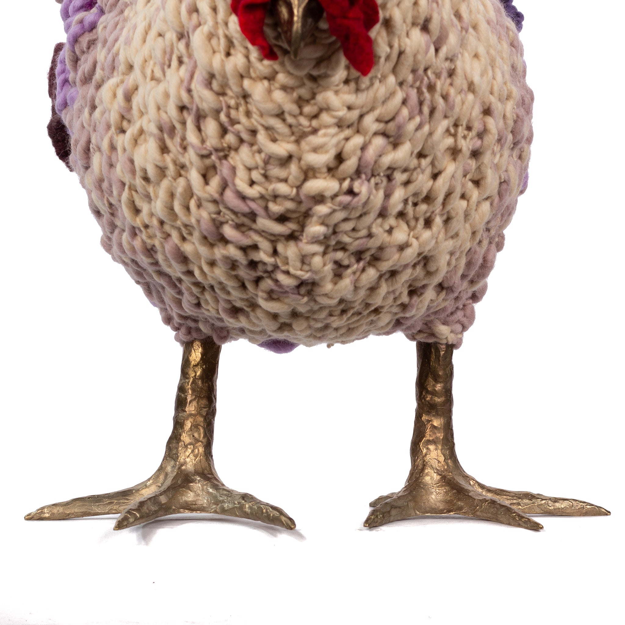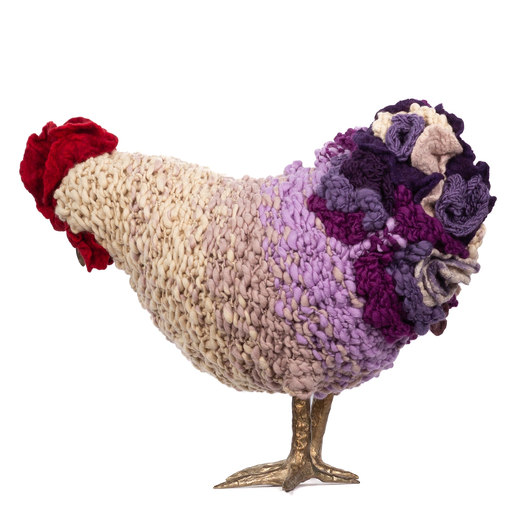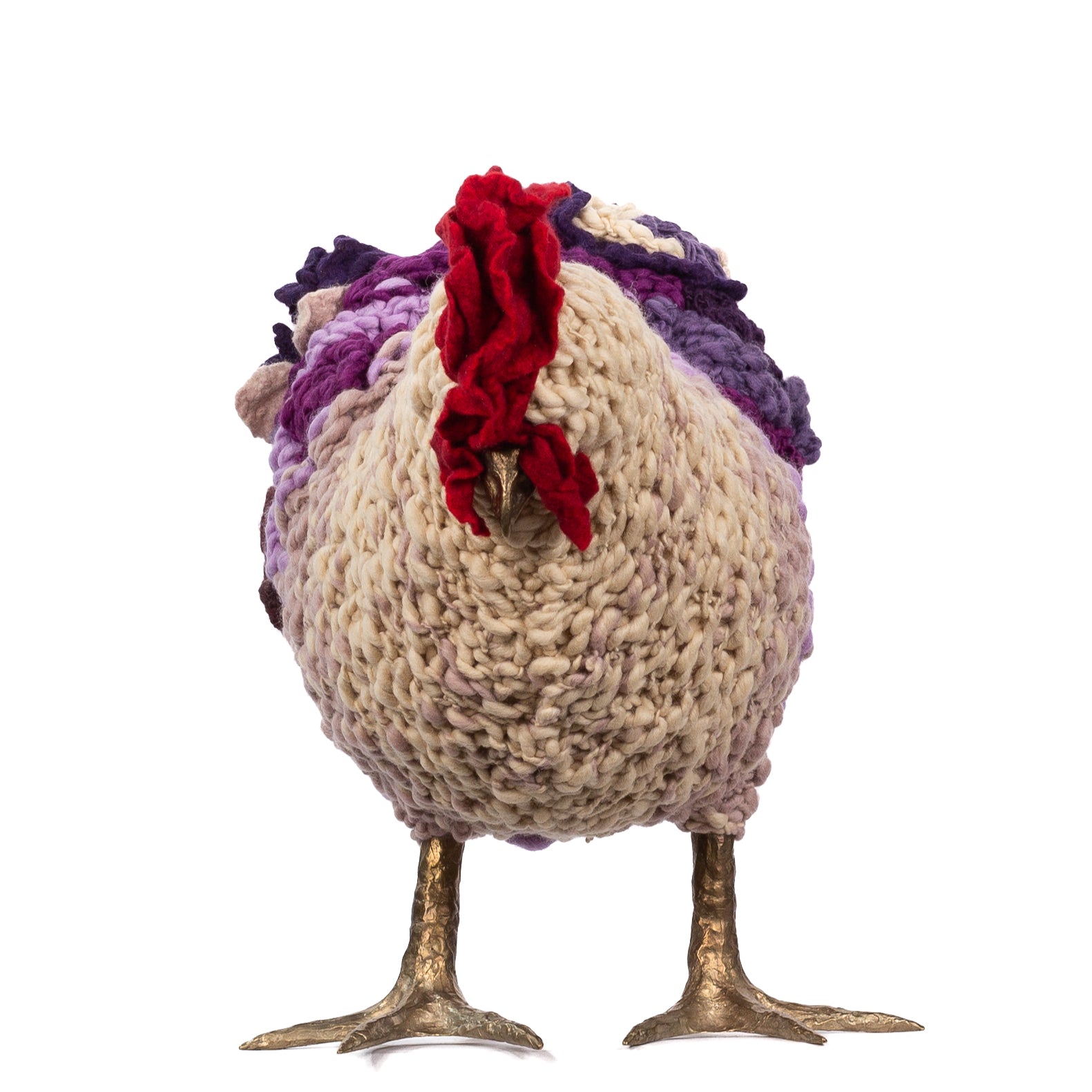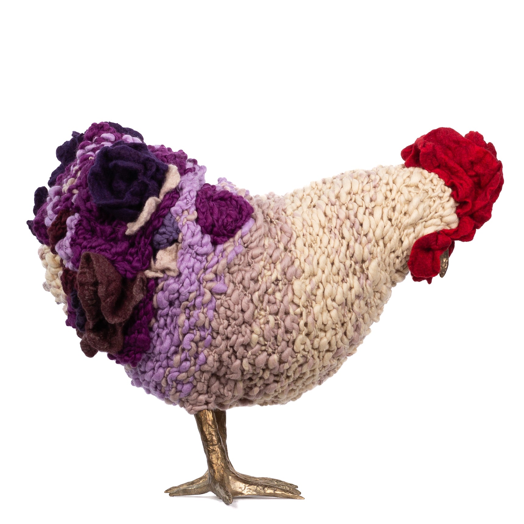 The chickens are sculpted in Kansas City, Missouri with care and delight, upholstered to function as footstools. Each is one-of-a-kind, unique in posture and personality. A turned wood egg-shaped core stands on bronze feet and is connected to a bronze beak. Feathers are fashioned with traditional fiber art techniques- dyeing, felting, spinning, knitting- and are stitched by hand. And a surprise? Their heads bob.