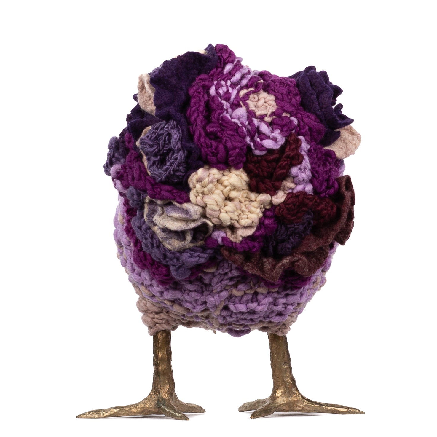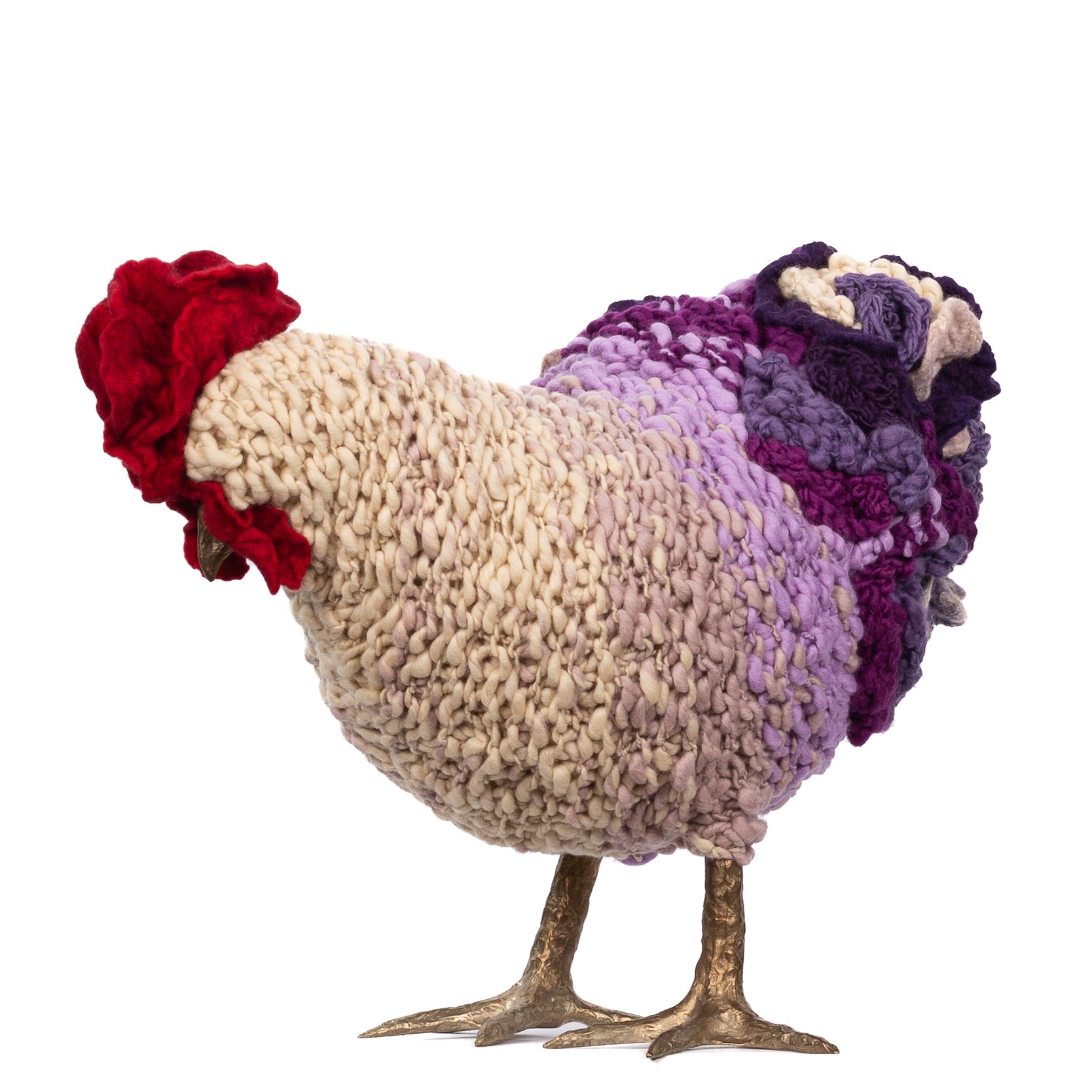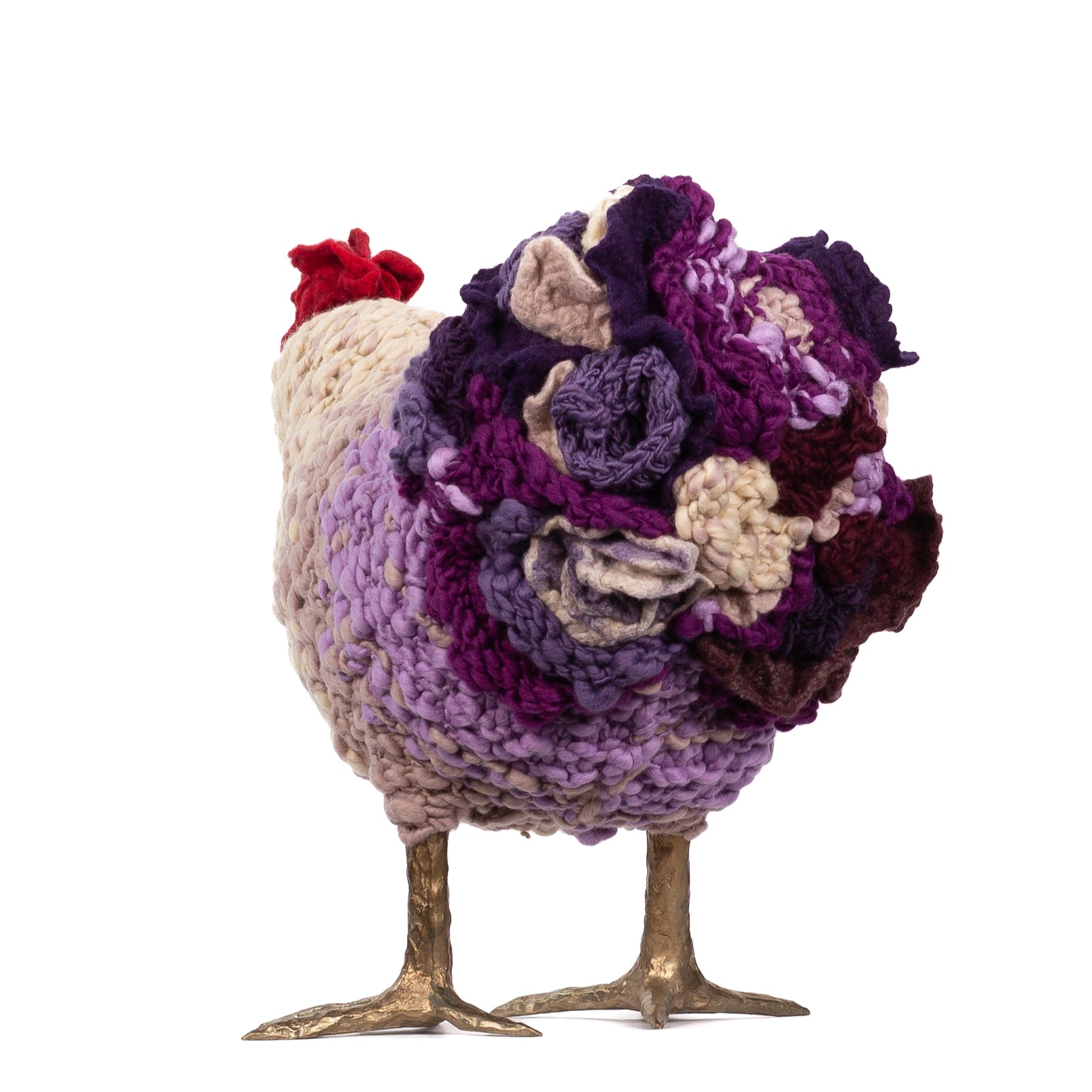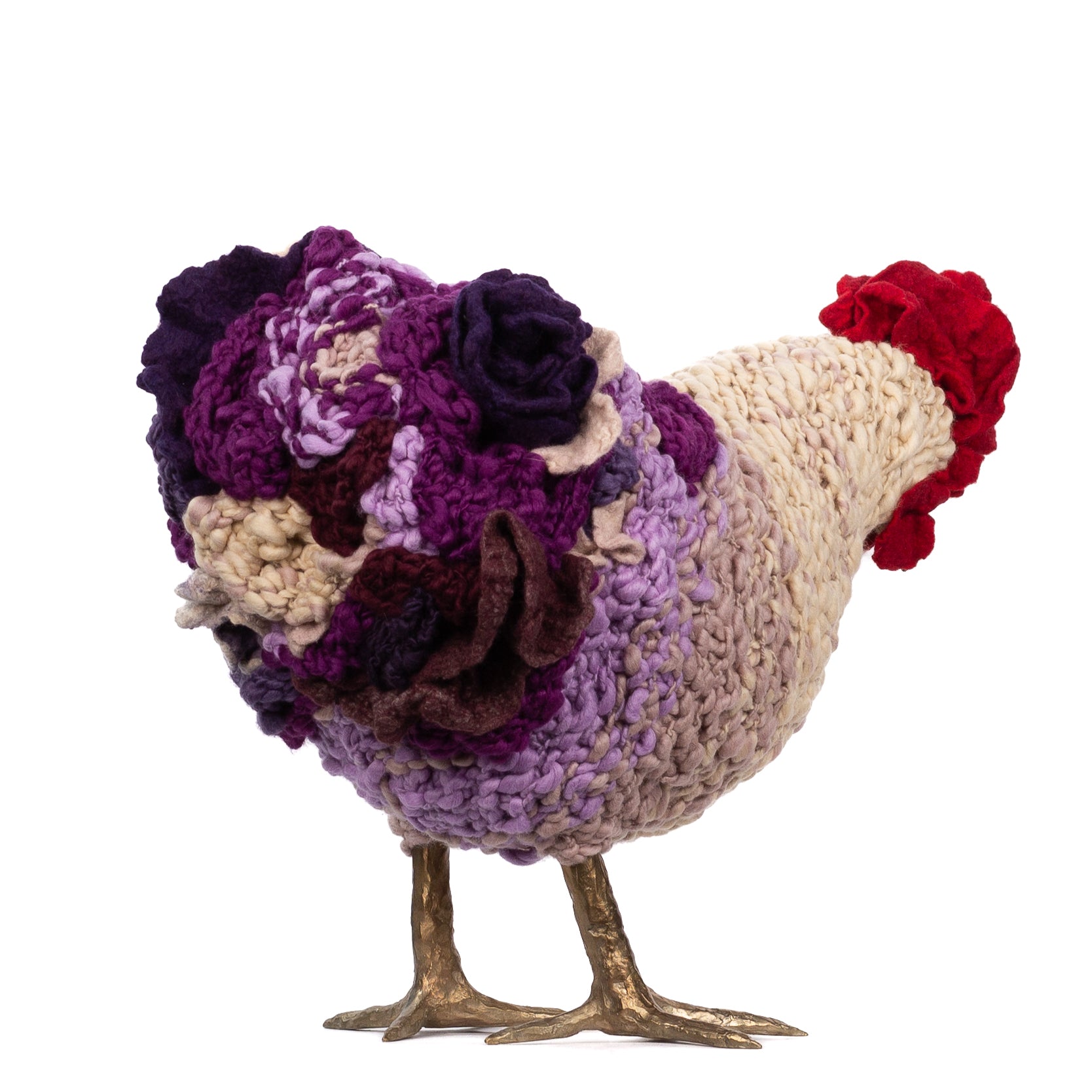 The chickens are sculpted in Kansas City, Missouri with care and delight, upholstered to function as footstools. Each is one-of-a-kind, unique in posture and personality. A turned wood egg-shaped core stands on bronze feet and is connected to a bronze beak. Feathers are fashioned with traditional fiber art techniques- dyeing, felting, spinning, knitting- and are stitched by hand. And a surprise? Their heads bob.